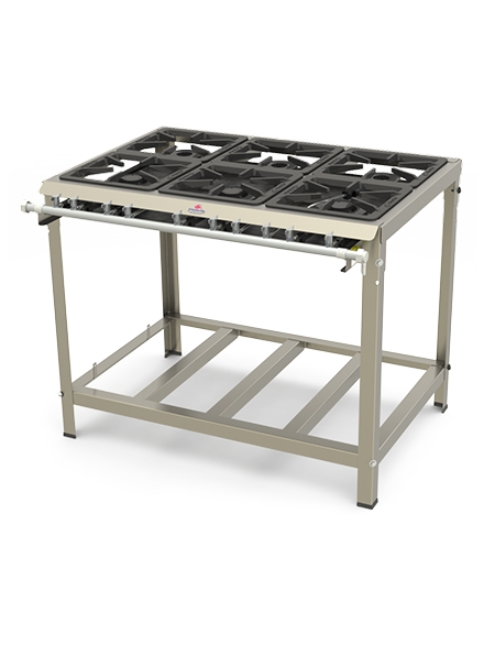-6 Queimadores, sendo 3 queimadores duplos e 3 queimadores simples com chama dupla;